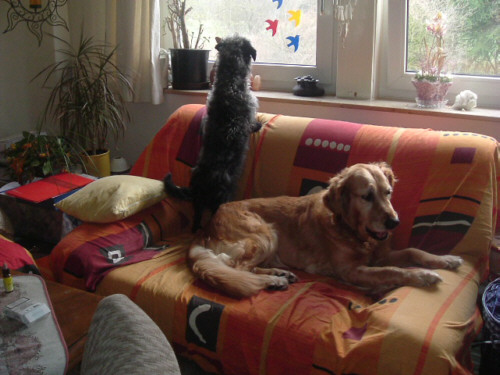 | | Beginn einer neuen Freundschaft |  | | Das Vertrauen wächst |  | | entspannt |  | 6.4.06 | Gestern lernte ich die ersten Katzen von Frauchen aus der Nähe kennen.